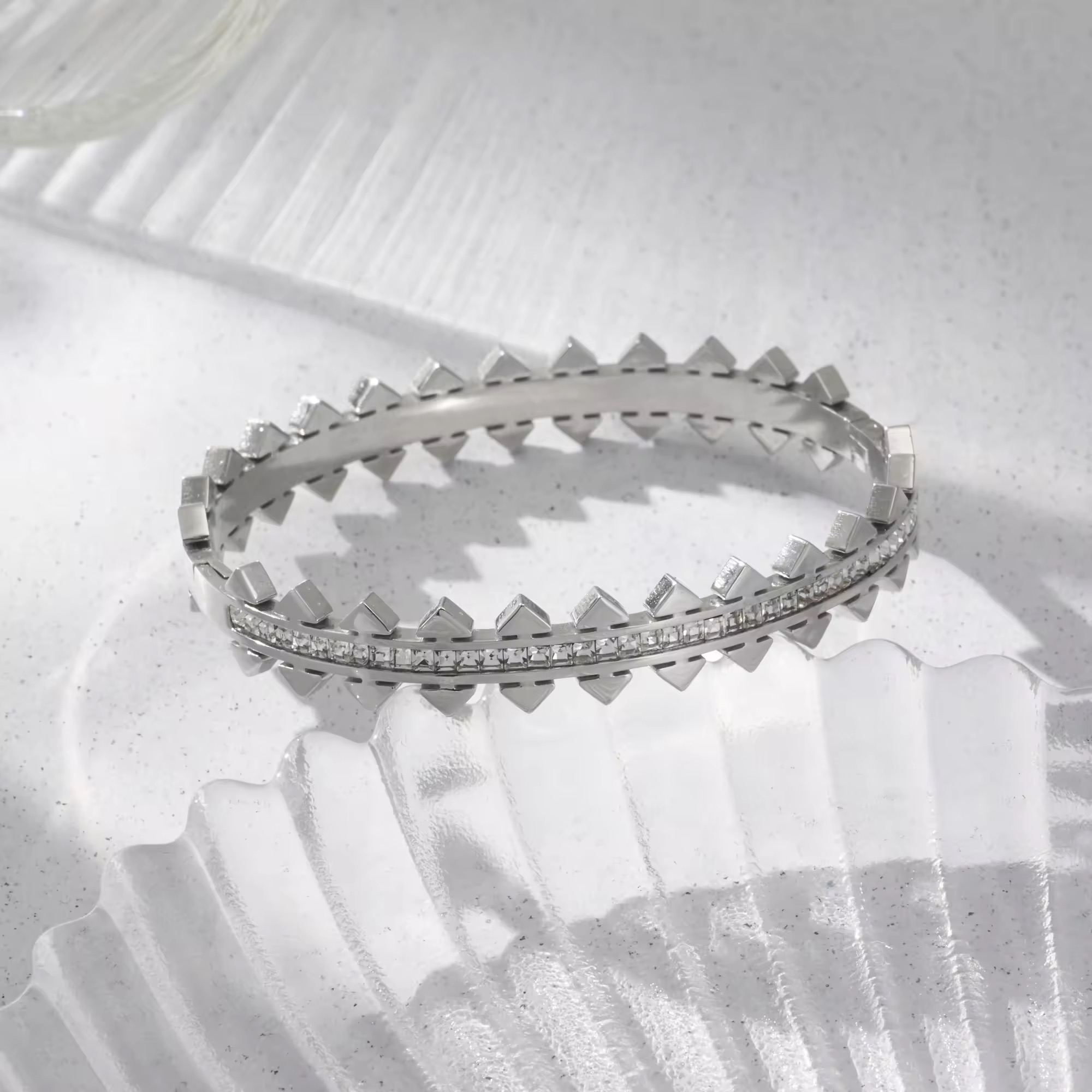 Silver cuff with jagged edges and a smooth line of zircon crystals. Sharp and brilliantly bold.