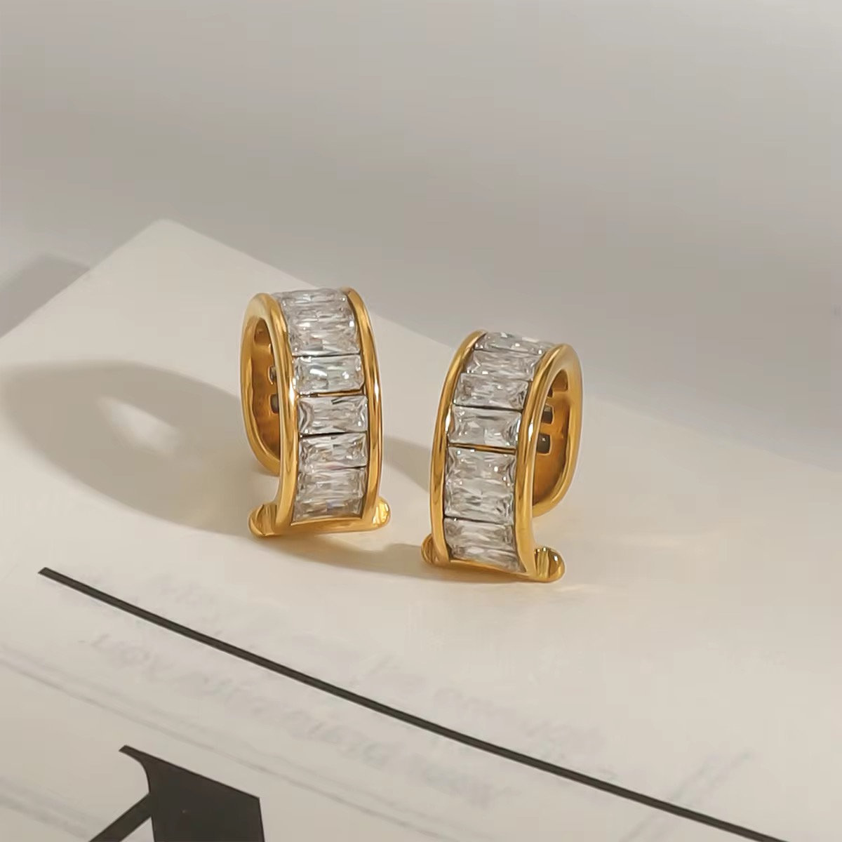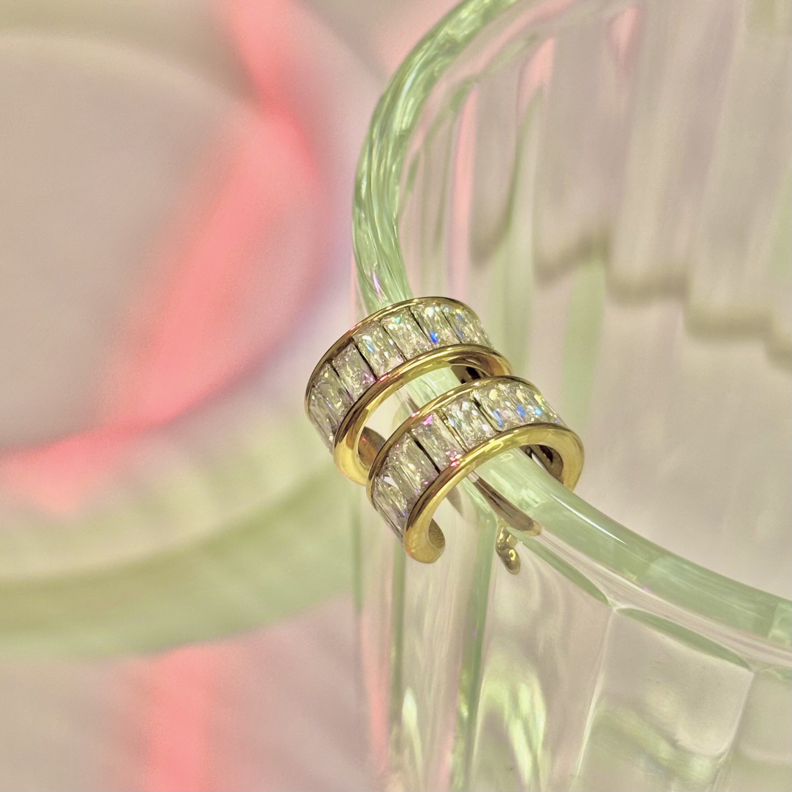 Gleaming gold cuff set with a sleek row of rectangular zircon crystals. Sharp, structured and radiant like a focused beam of light.