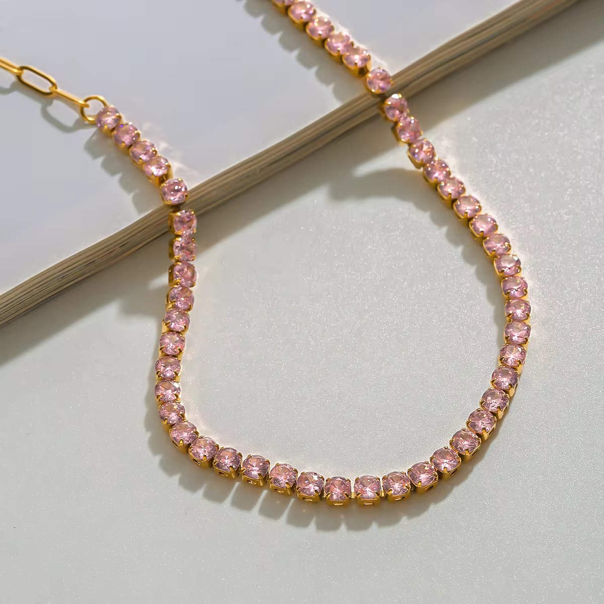 A strand of soft pink stones in perfect rhythm. Sweet yet sharp.