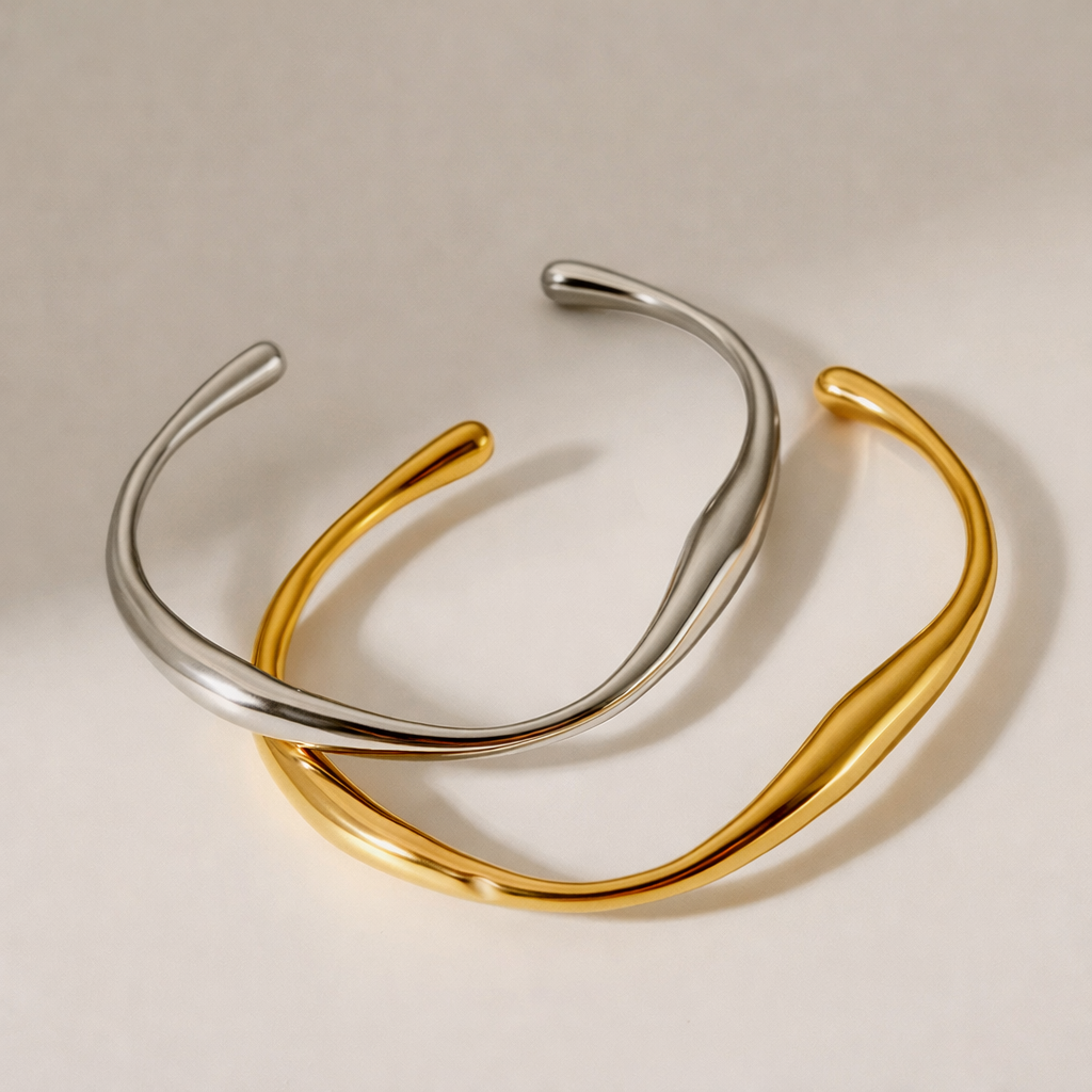 Polished silver and gold open cuffs.