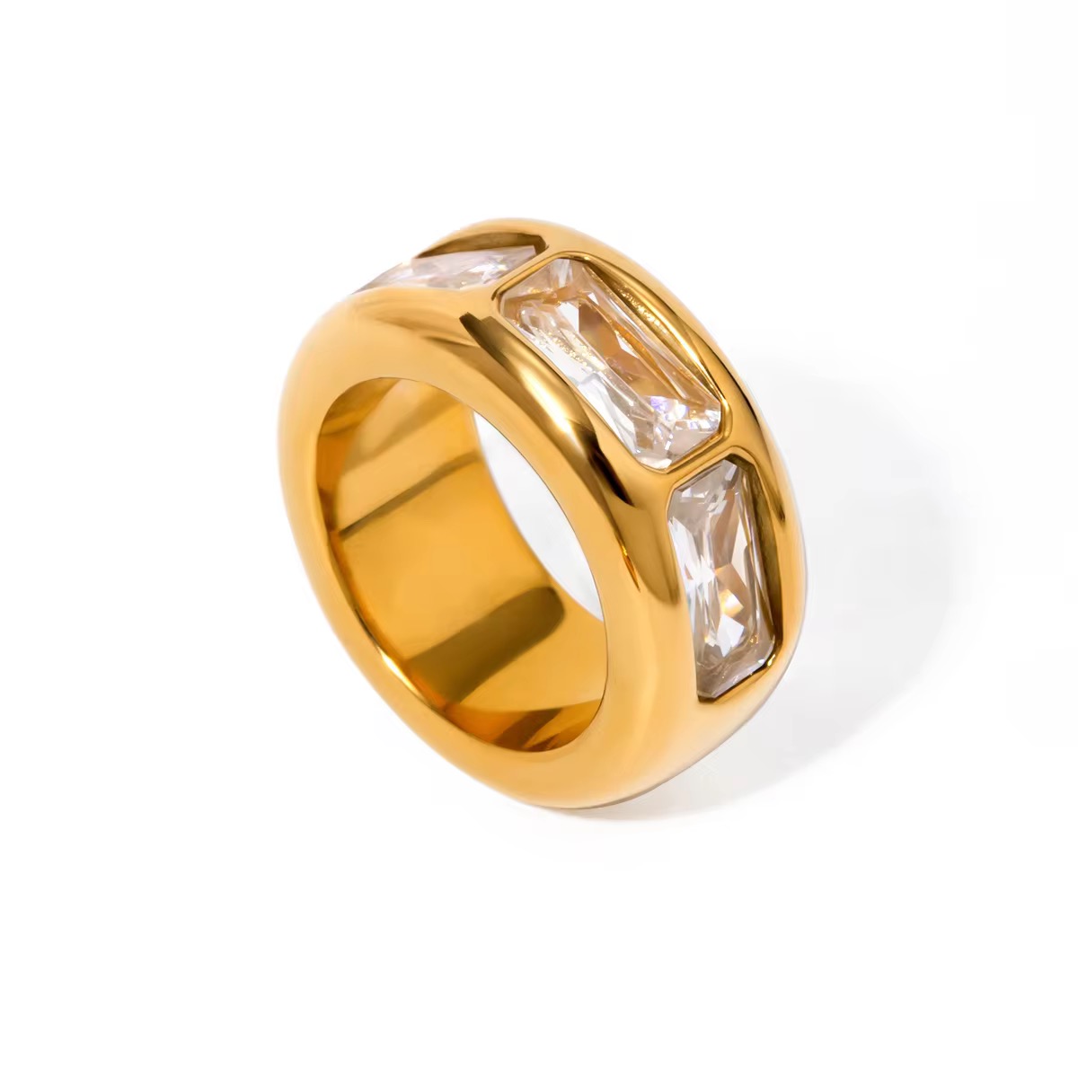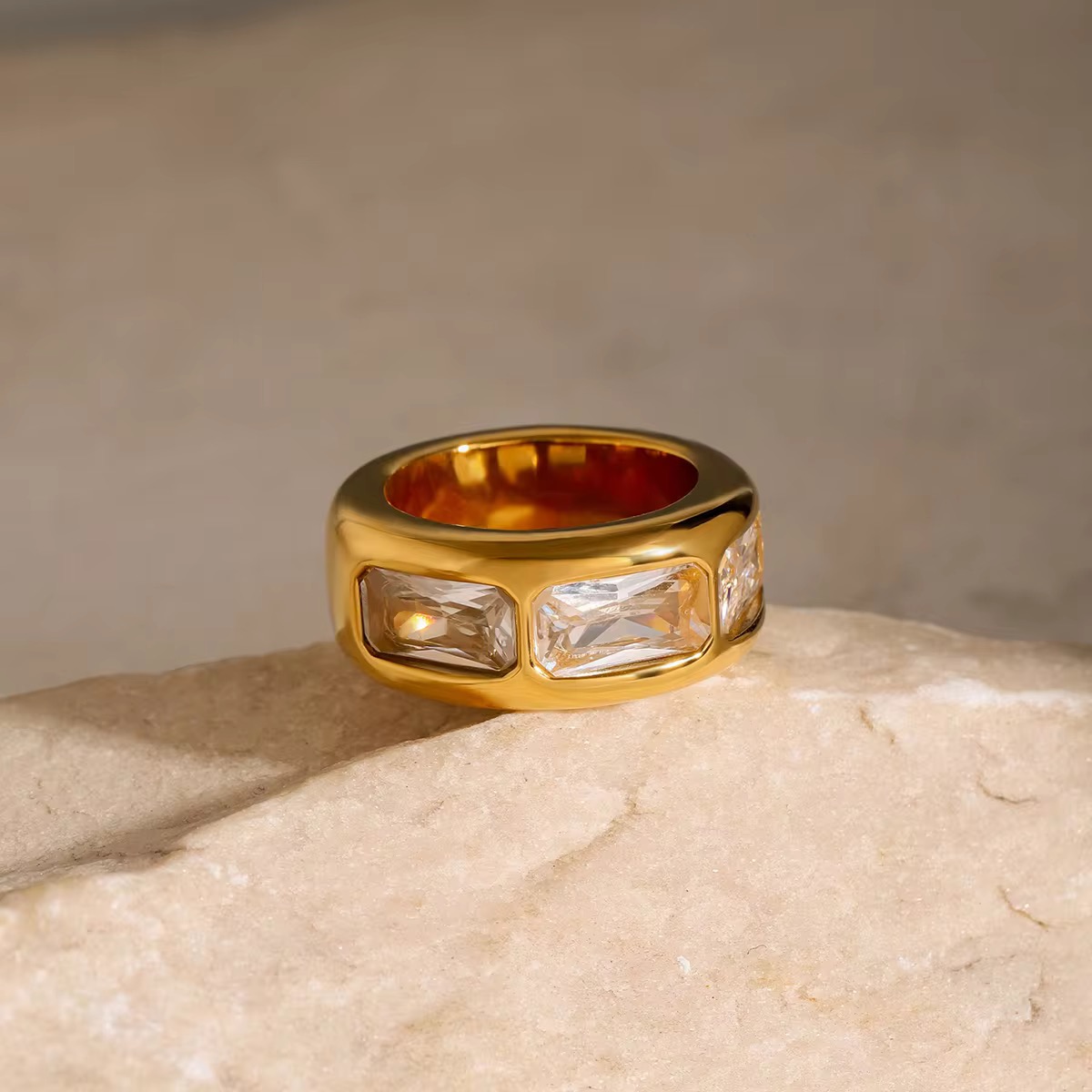 A bold chunky band set with twin radiant stones. Clean, sculptural and luminous – made to stand out.