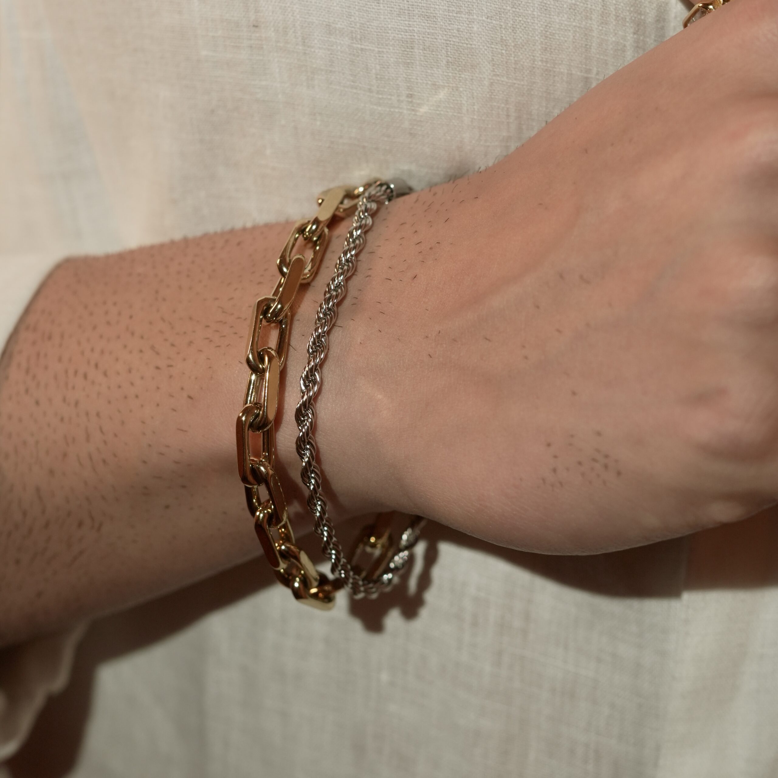 Twisted silver rope chain bracelet with an adjustable clasp, sleek and versatile.
