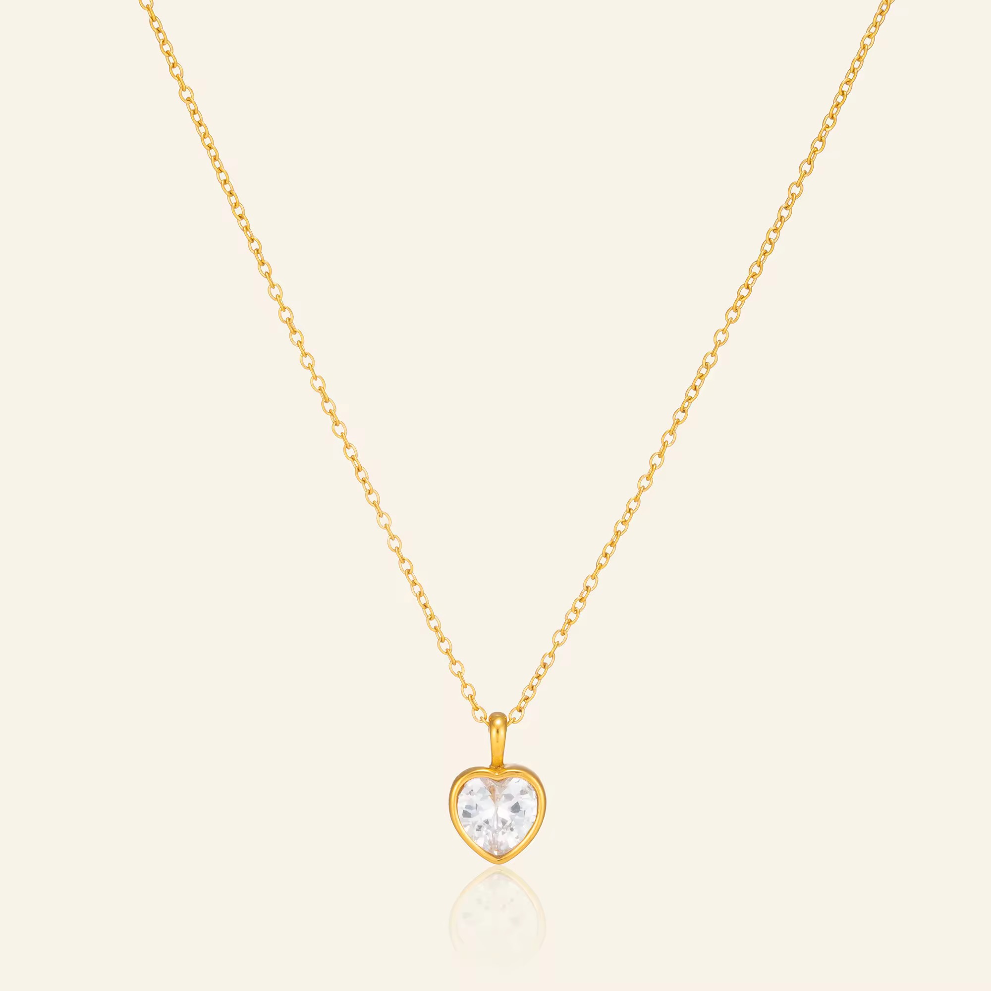 Gold heart pendant with a clear faceted stone.