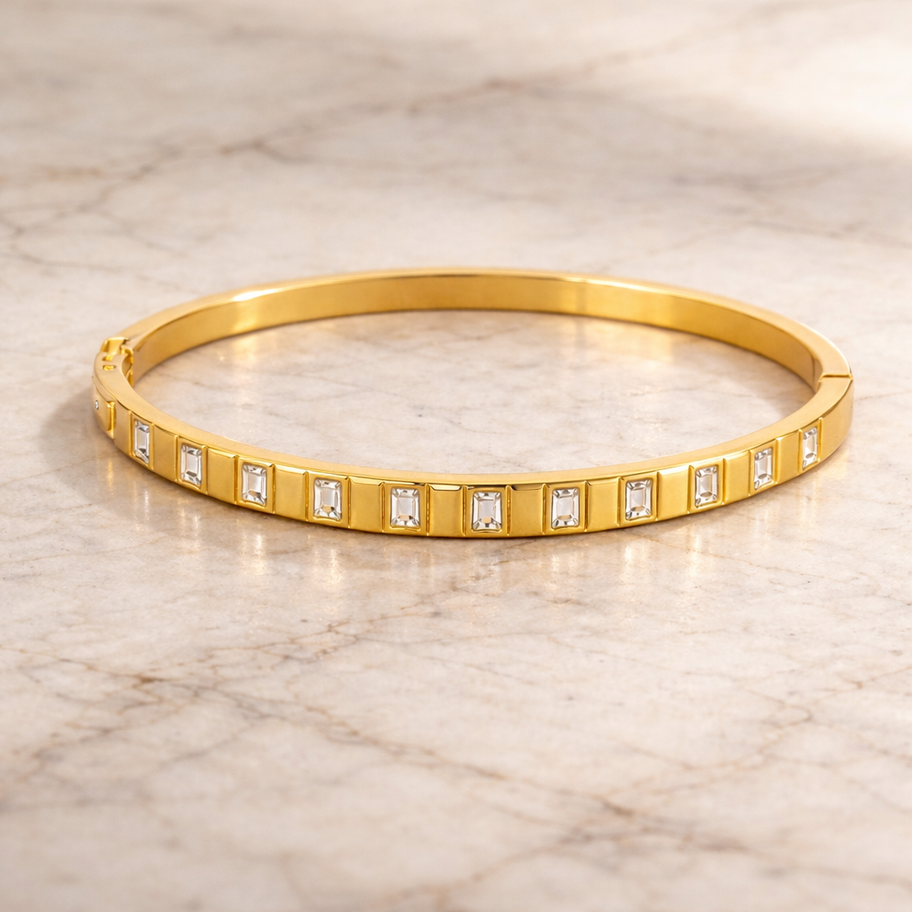 Slim gold bangle with baguette-cut stone detailing.