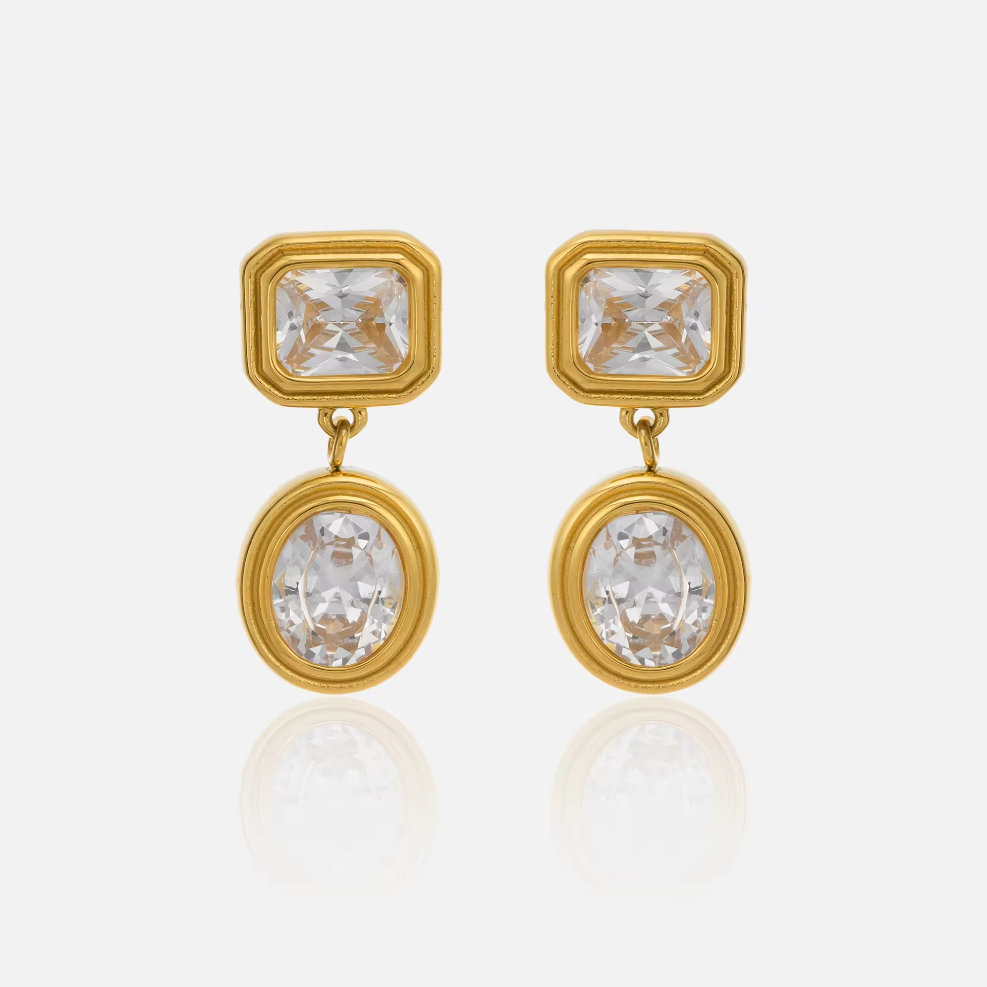 Modern and clean-cut dangle earrings with geometric zircon crystals that gleam like starlight. Pure, radiant and sharp.