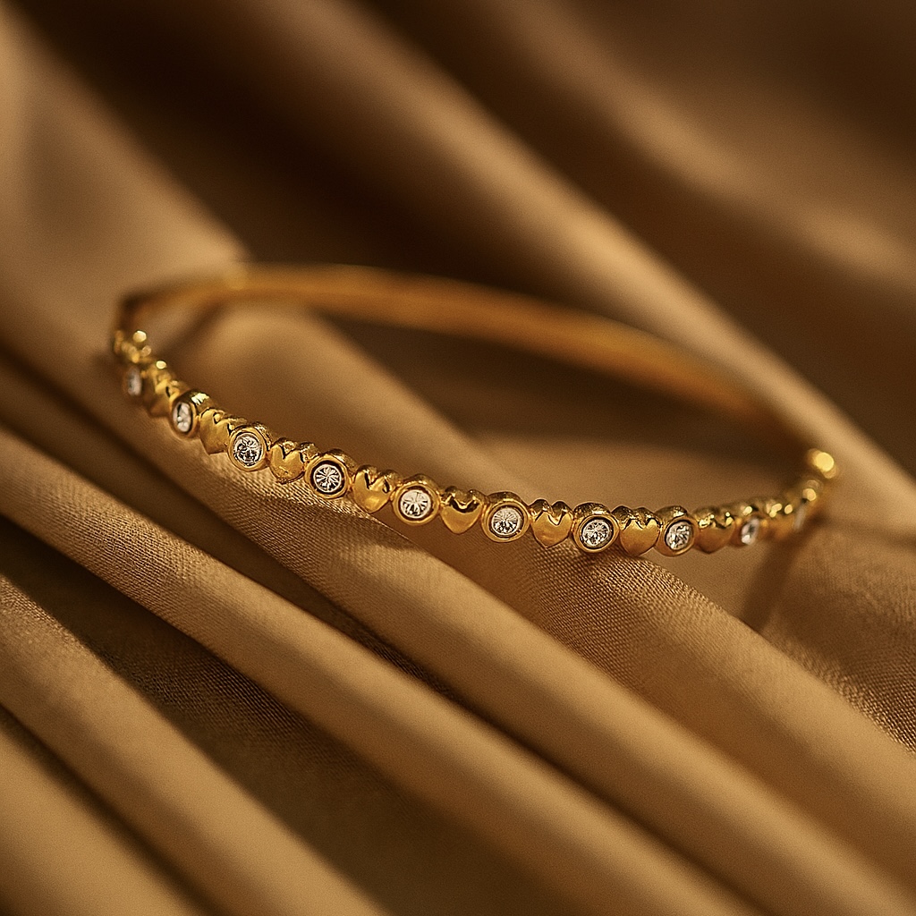 A slim bangle of gold hearts and zircon crystal dots. Delicate, radiant and great for everyday looks.