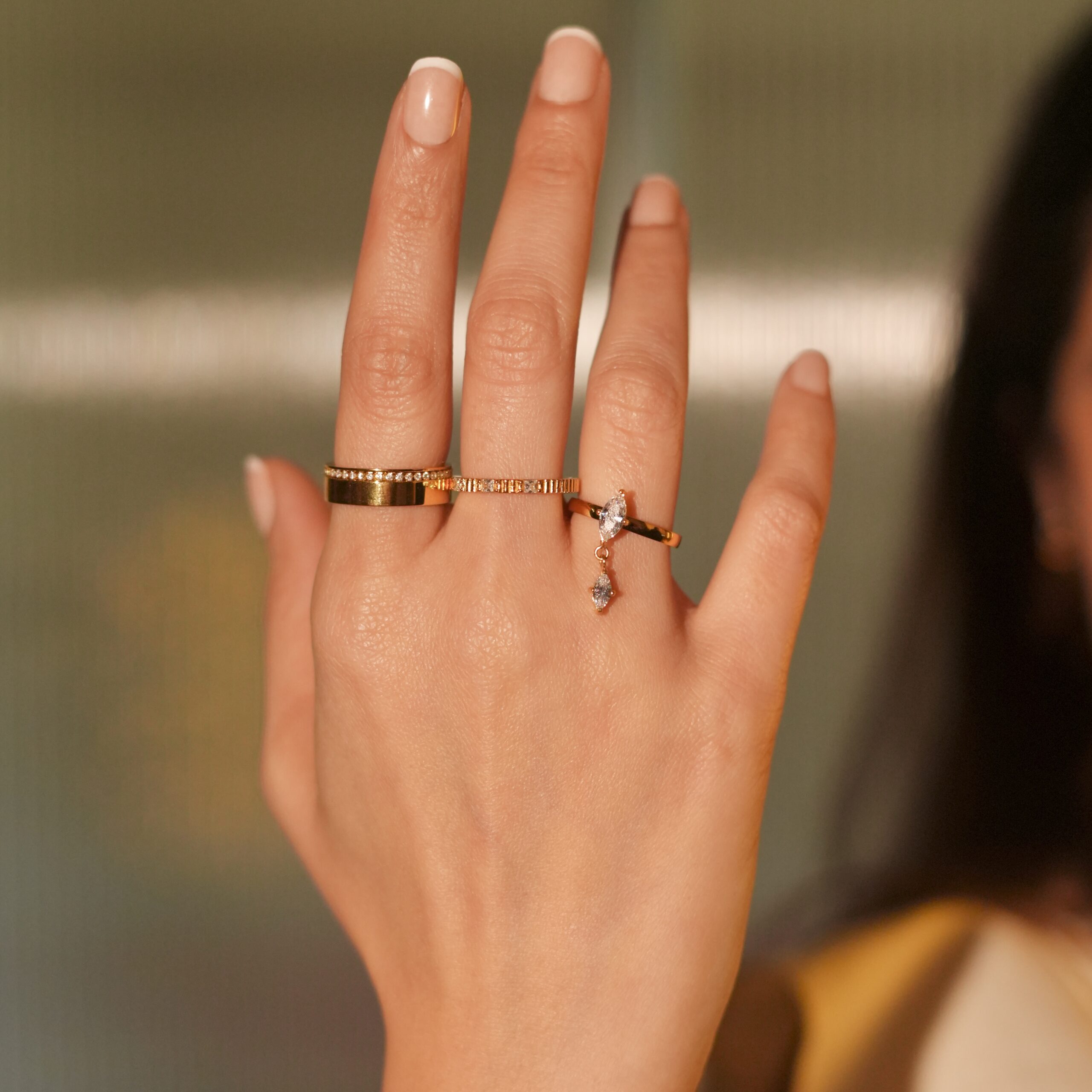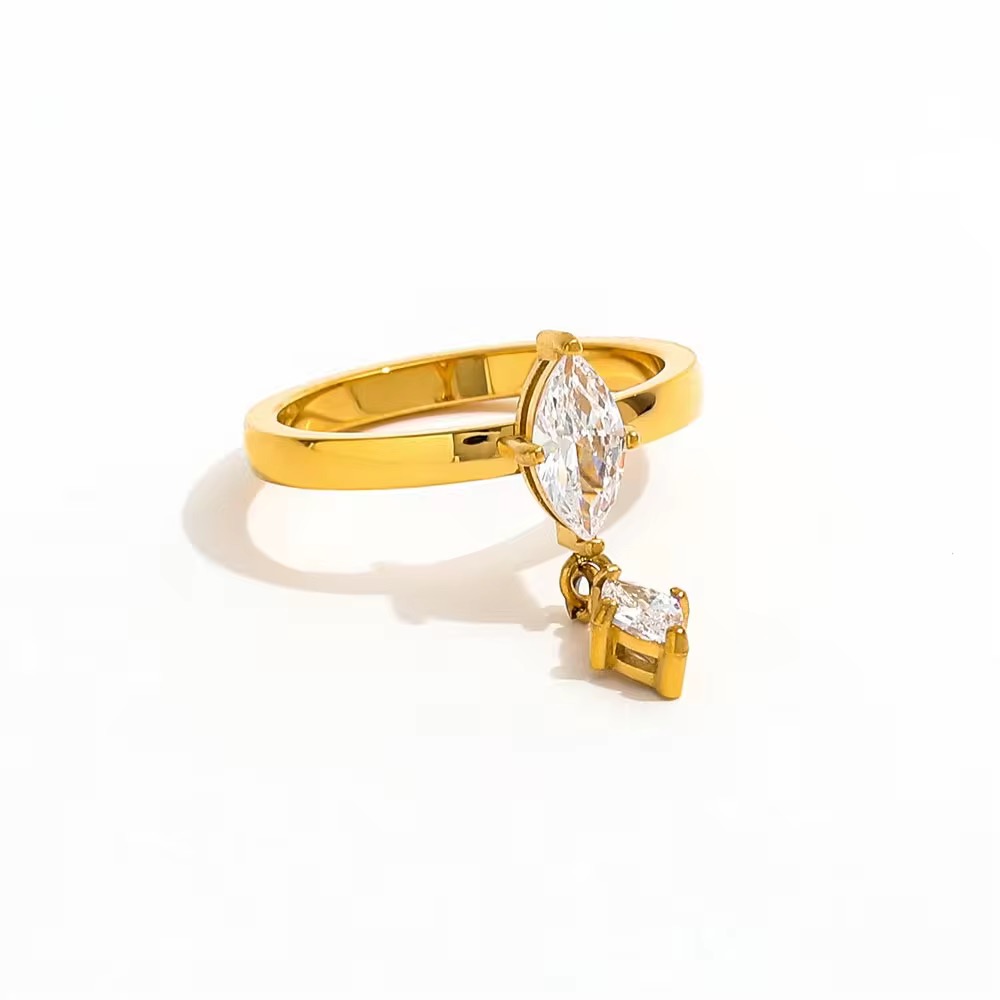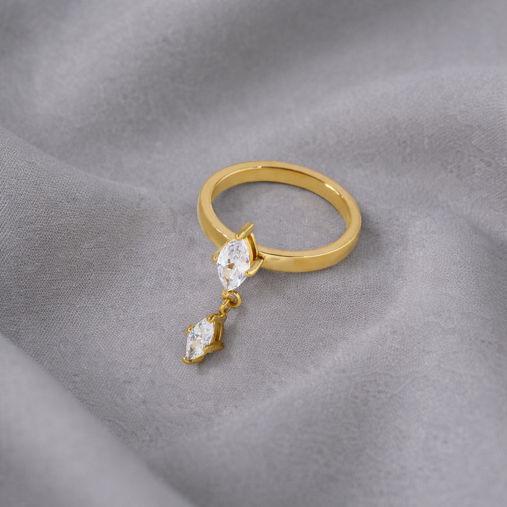 Slim gold band with a marquise stone and delicate drop detail.