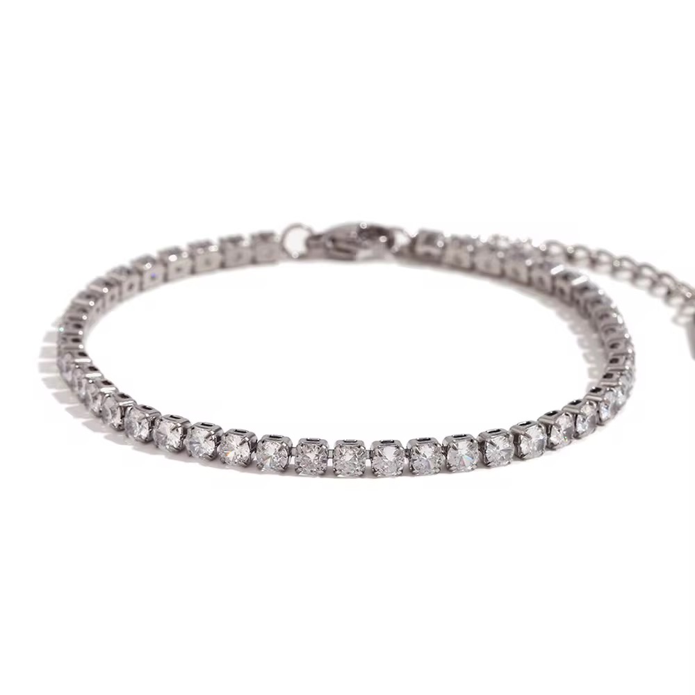 A refined silver tennis bracelet adorned with a row of brilliant-cut stones, offering a sleek and timeless sparkle.