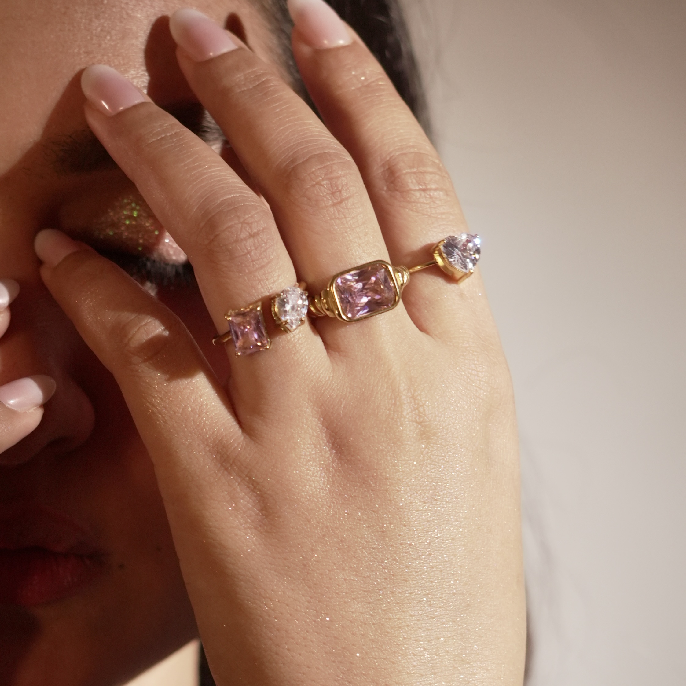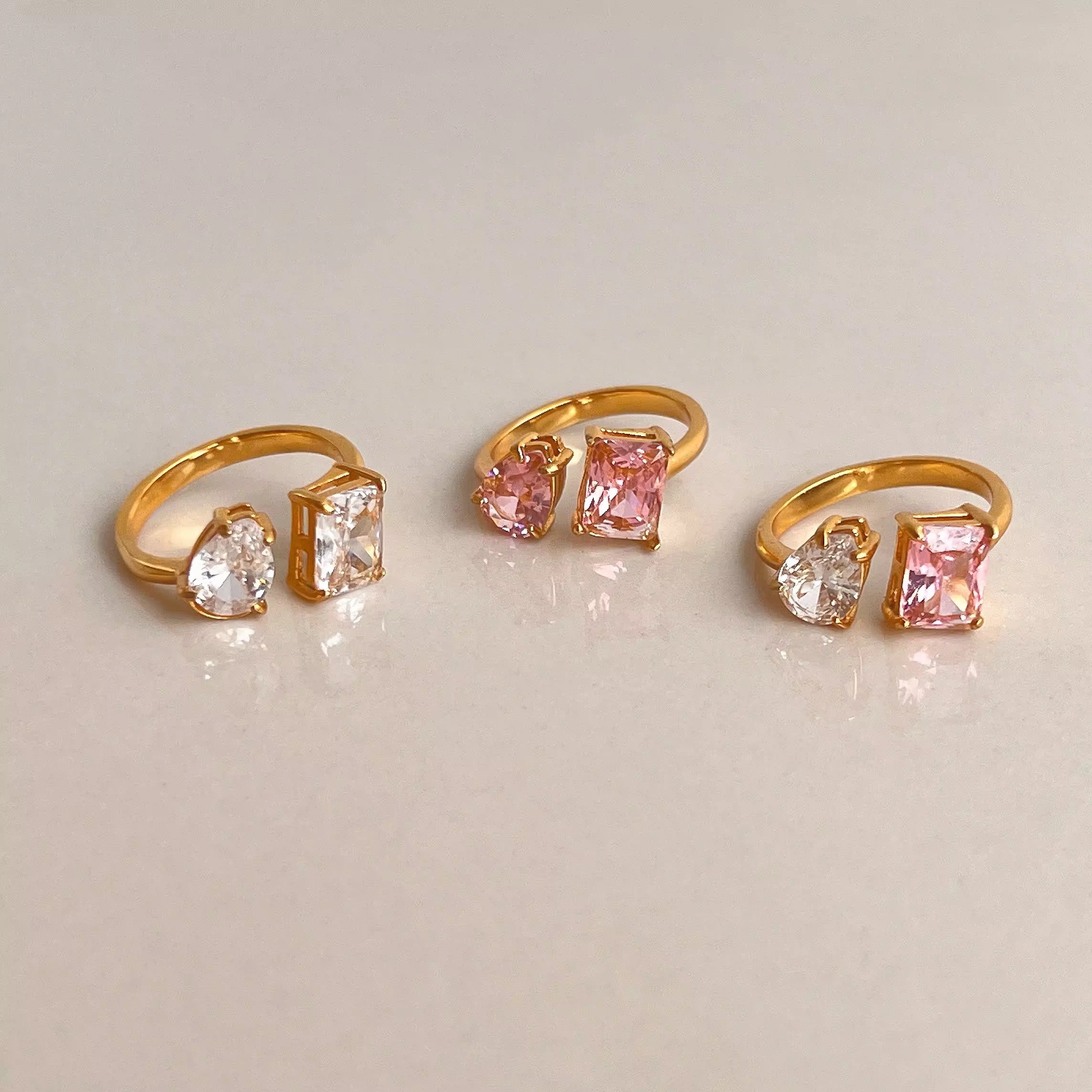 Bold square-cut and pear shaped stackable. Compact radiance.