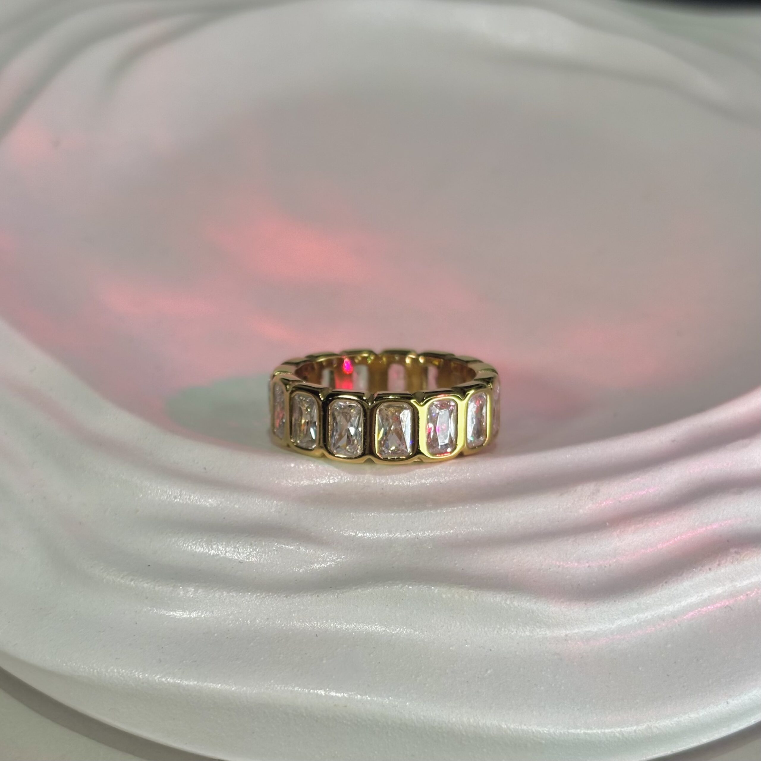 Bold gold meets lucid light. A statement band that gleams from every angle.