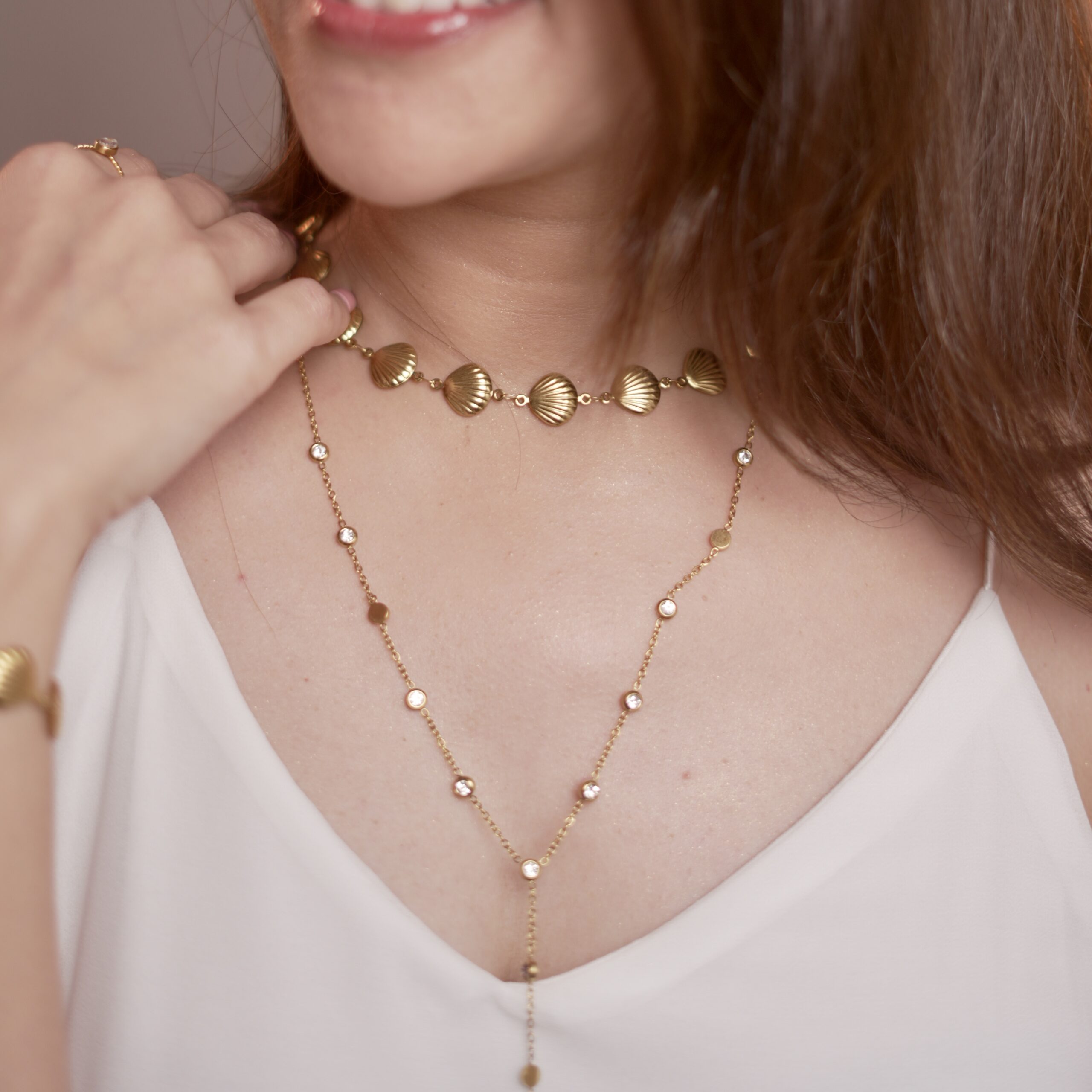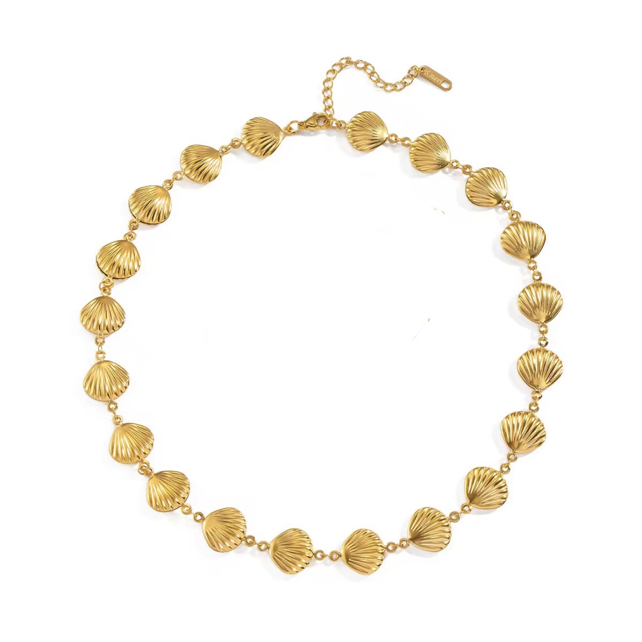 Sculpted gold shell links strung together like coastal relics. Playful, radiant and full of beach nostalgia.