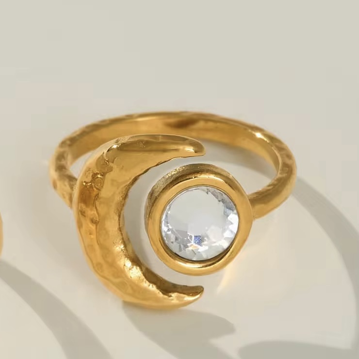 A golden crescent cradling a crystal. Eclipse energy in a ring.
