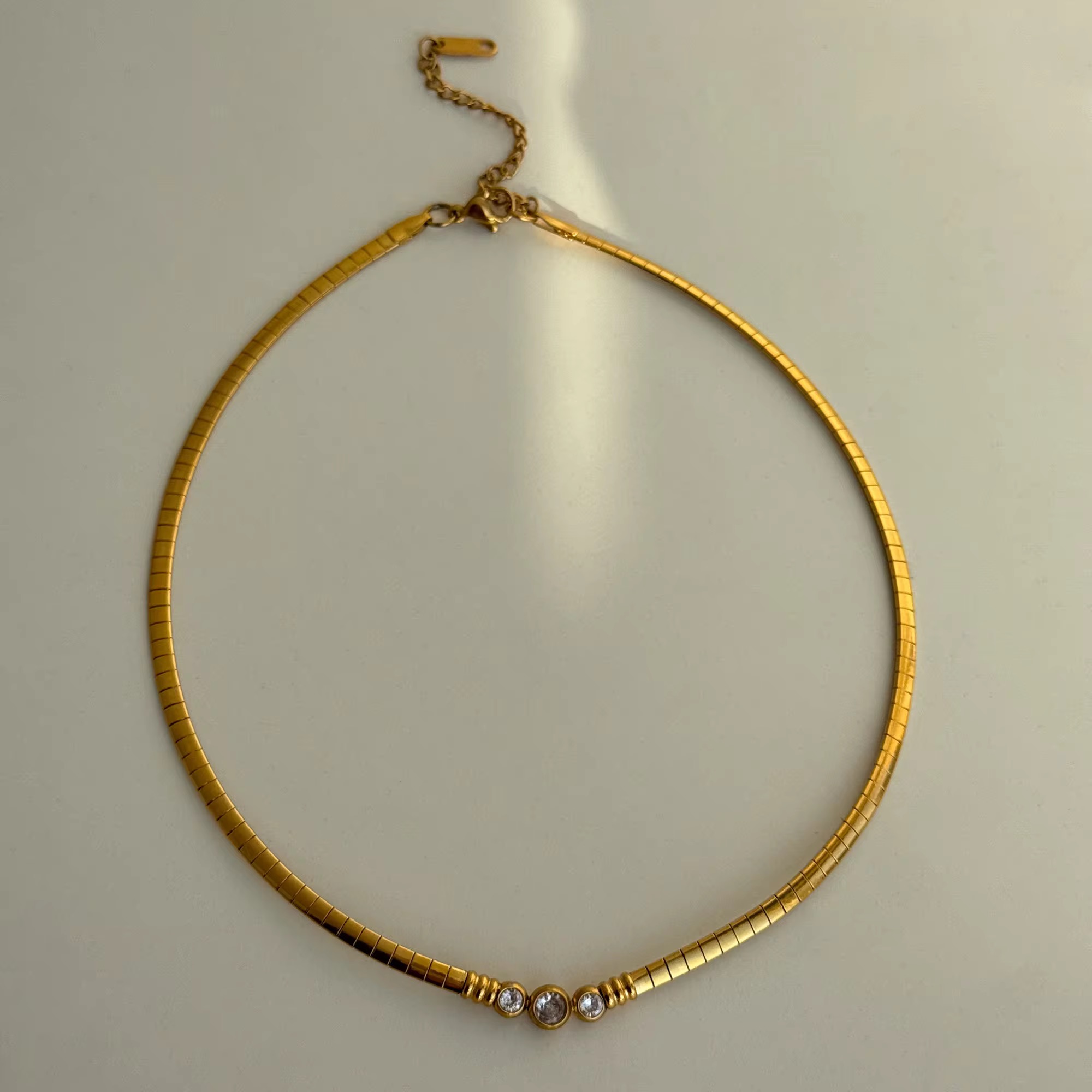 A sleek gold choker with twin zircon crystals accents at the center. Fluid, modern and made to move with you