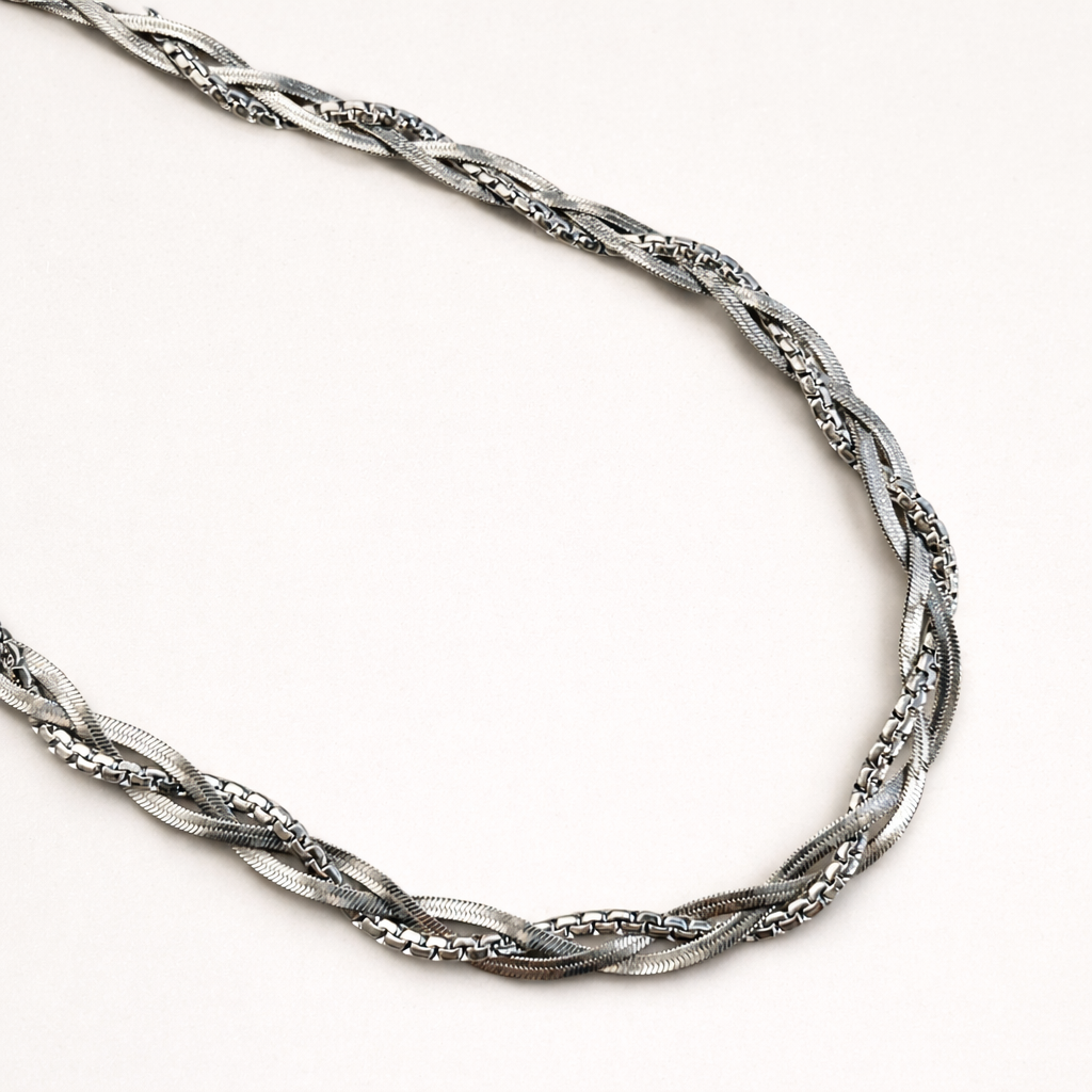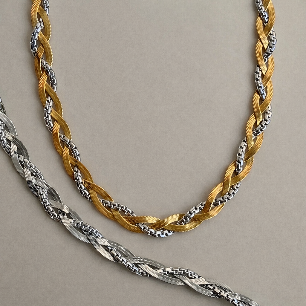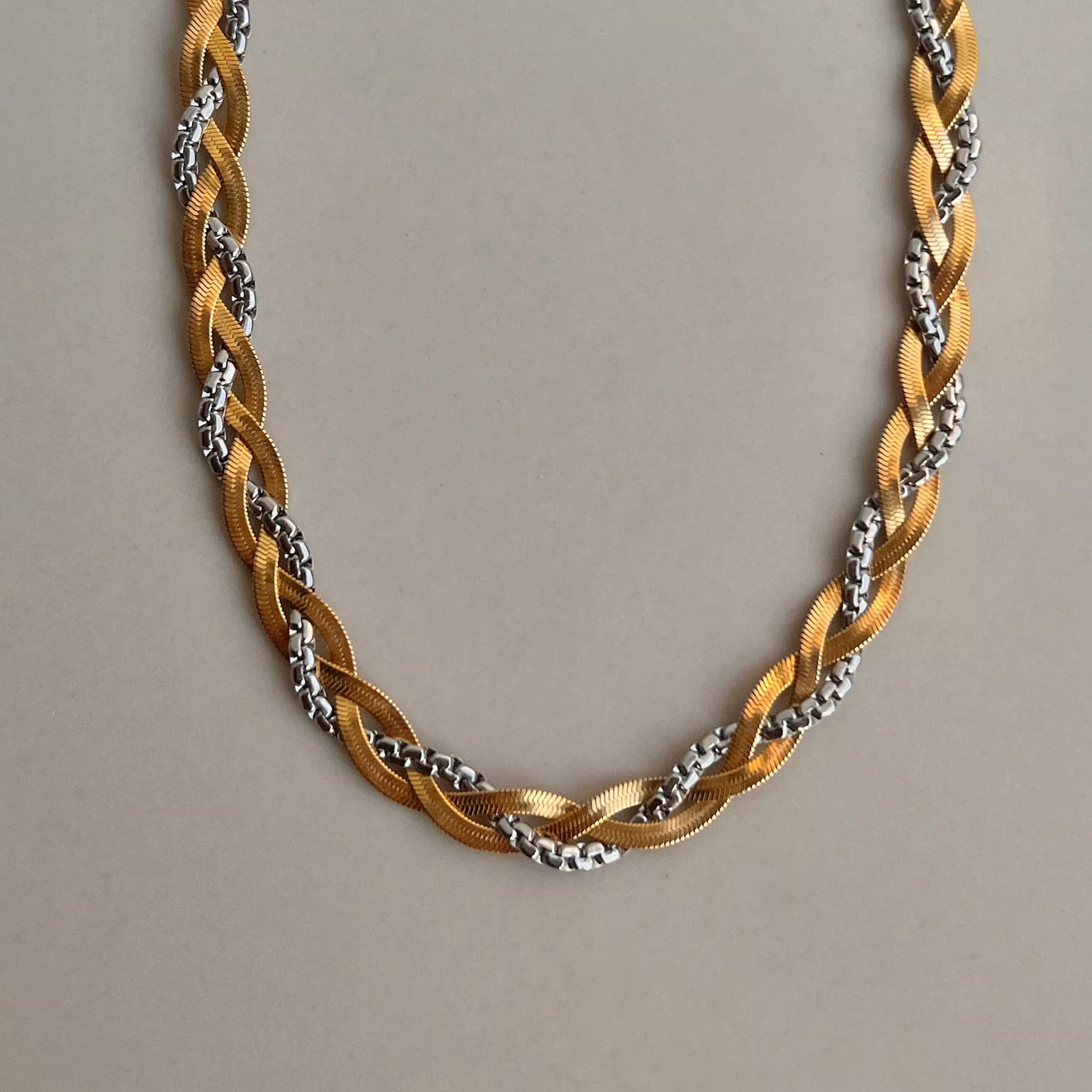 Bold, intertwined strands of gold and silver create a striking two-tone statement.