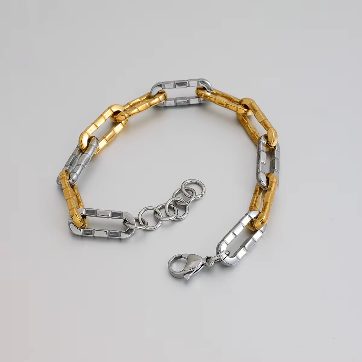 Two-tone industrial links with ridges and soft polish.