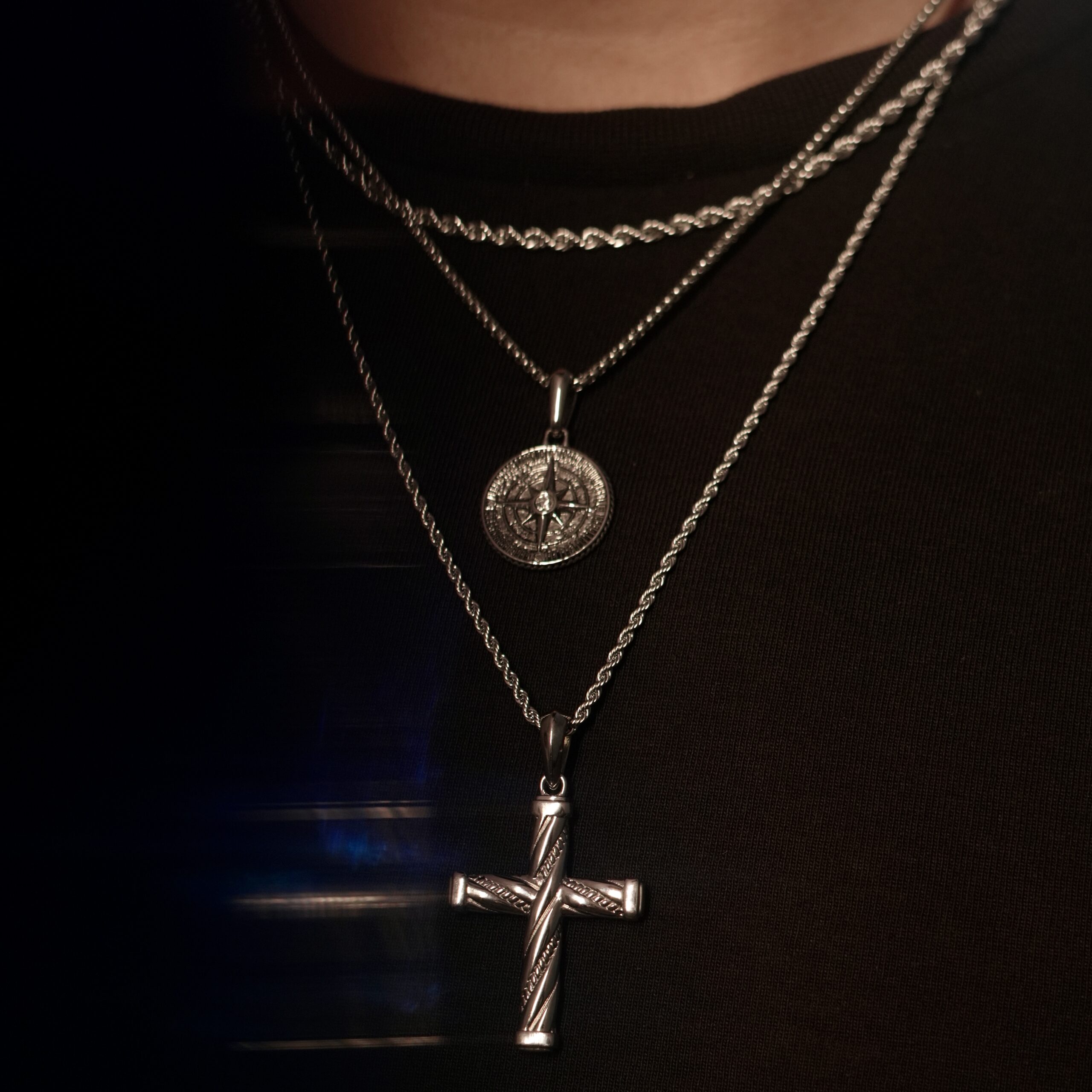 A rugged cross pendant with rope detailing, blending modern minimalism with timeless grace.