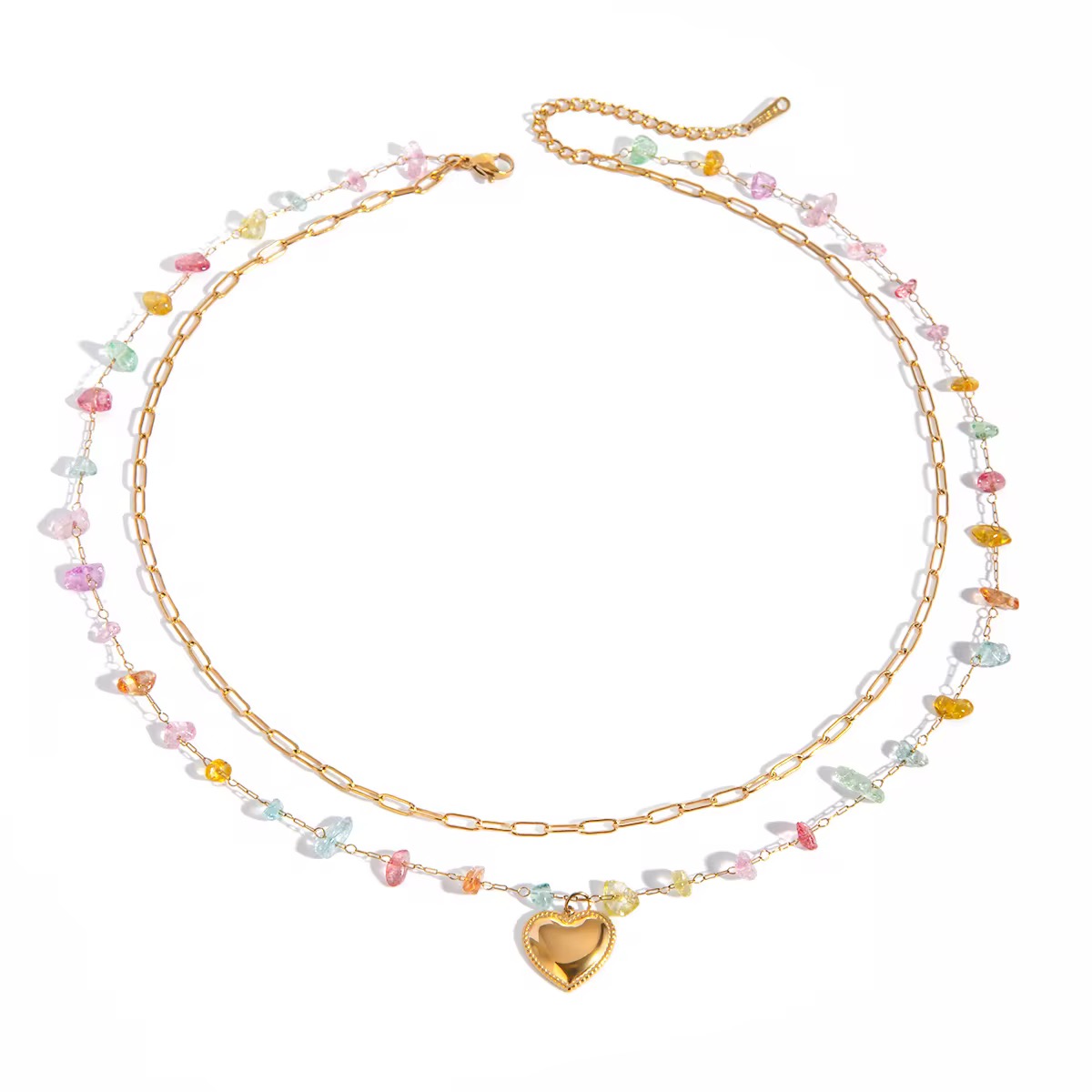 Twin chains lined with pastel crystals and a heart charm. A soft playful sparkle with a golden glow.