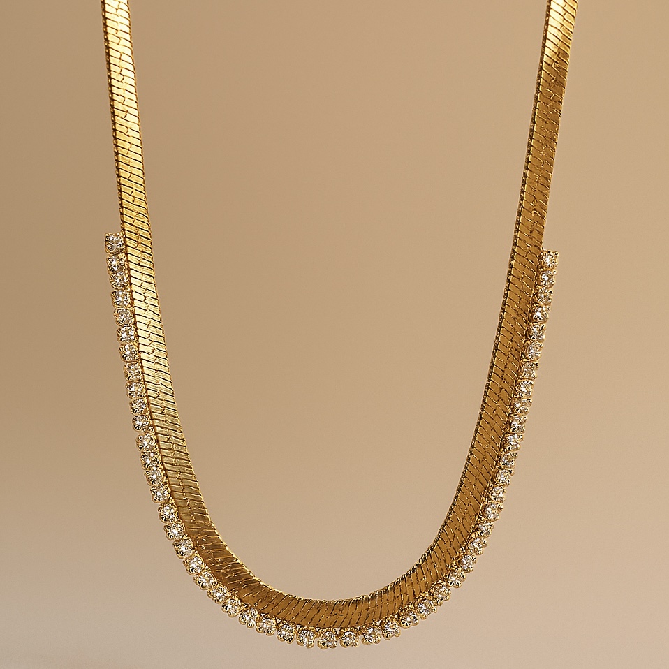 A gold mesh chain with a row of zircon crystals that catches light like water. Refined, bold and endlessly wearable.