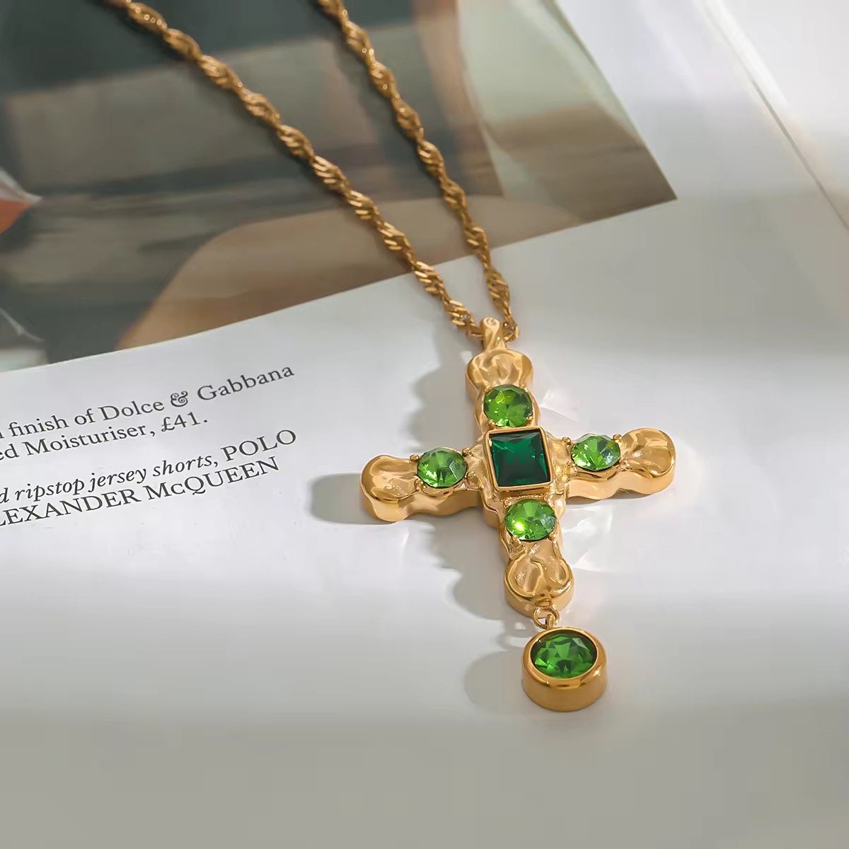 A sculpted cross with deep green zircon stones and gold accents. Striking, grounded and full of presence.