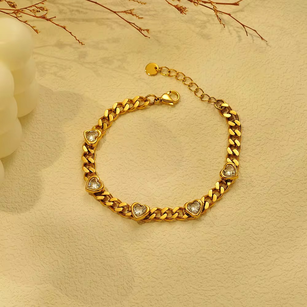 Chunky gold curb chain with heart-cut zircon crystals. Bold softness.